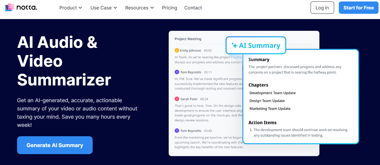 Notta is quite a transcriber and summarizer champ, sought after by most content creators and pros who need their video documentation accurate.