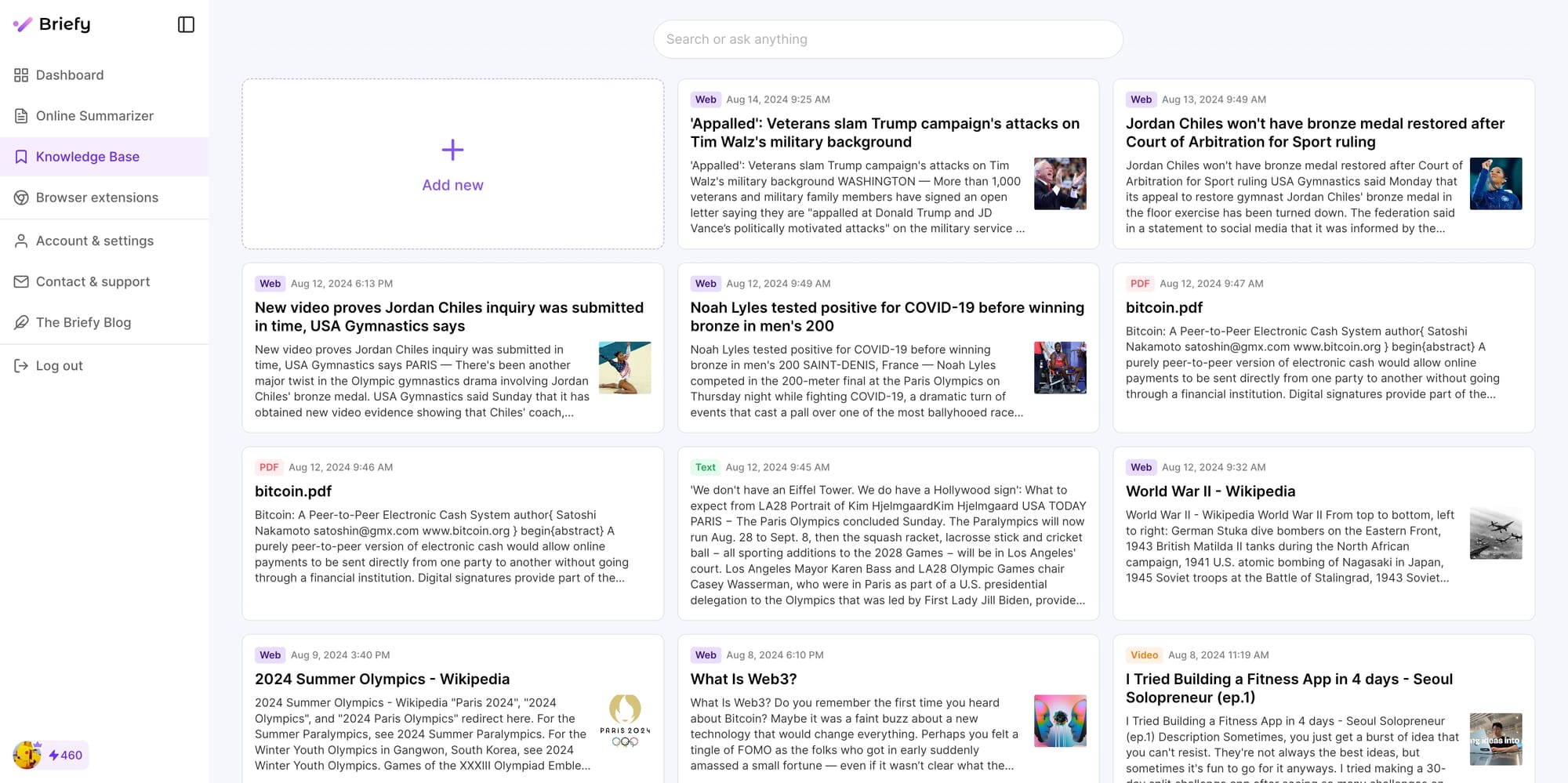 🥇I would recommend Briefy again for its Knowledge Base feature. In addition to AI-driven summarization, Briefy offers each user a customized knowledge base to simplify the handling of your saved summaries. It acts as a virtual second brain, holding all your knowledge in a way that makes it easy for you to access everything quickly and remember everything you need. You can look up stored summaries using keywords, or directly pose questions regarding any content available in the entire knowledge base, similar to communicating to a live assistant. With Briefy, you have the ability to efficiently handle the constant flow of information and concentrate on what's truly important, whether it's for professional or personal pursuits.