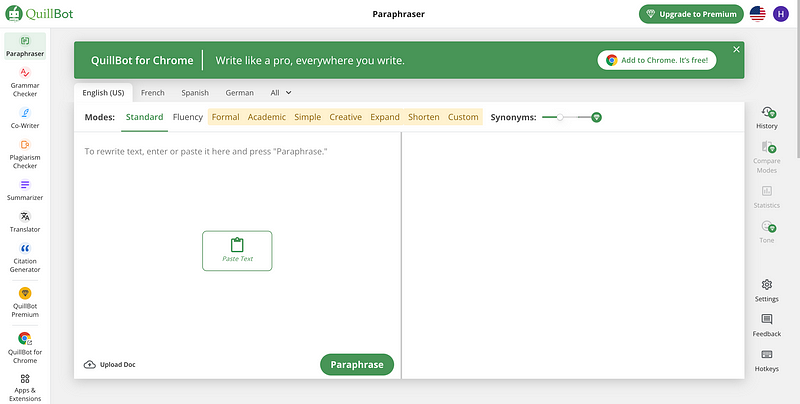 Key Features: QuillBot stands out with its versatile AI-driven features including a paraphrasing tool with various modes for different writing needs, a comprehensive grammar checker for multiple English dialects, and a reliable plagiarism detector. Additionally, it offers a co-writer feature for research assistance and sentence auto-completion, and a citation creator that supports several citation styles, streamlining the writing and referencing process for academics and professionals alike.
