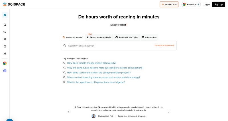 Key Features: Elicit’s primary strength lies in its sophisticated searching capabilities. It can locate relevant papers without the need for perfect keyword matches, a common limitation in traditional search engines. This AI tool not only finds pertinent papers but also summarizes key takeaways and extracts vital information specific to the researcher’s query. Additional capabilities include analyzing and organizing multiple papers, which can be uploaded as PDFs, and providing assistance in narrowing or adjusting research directions.