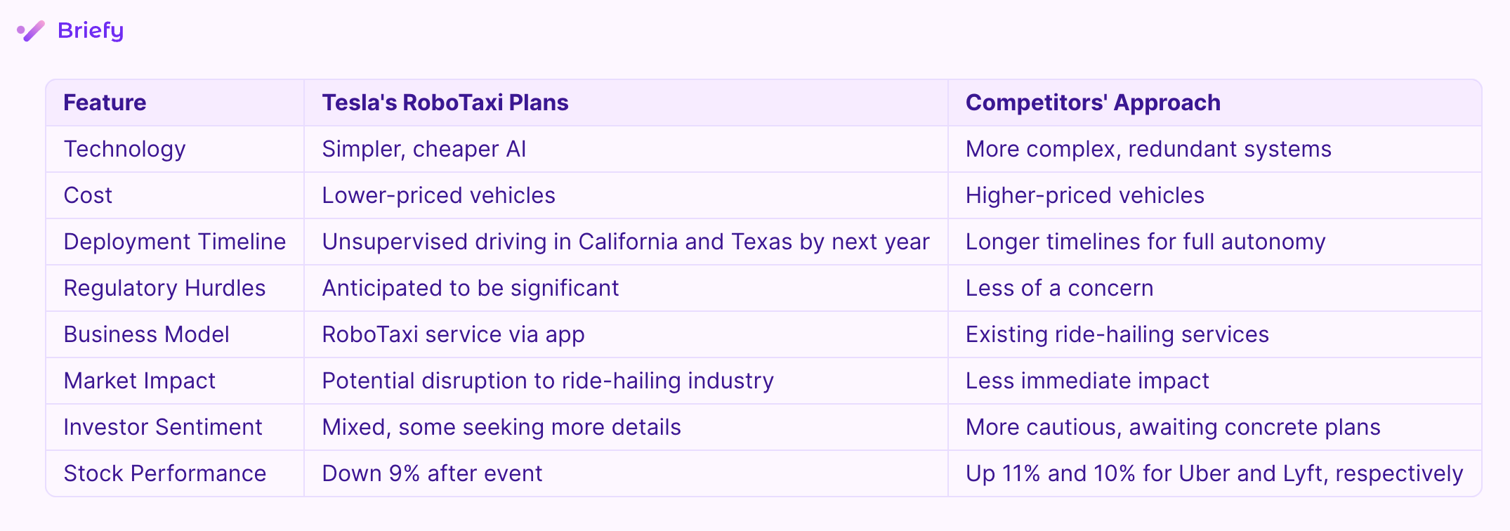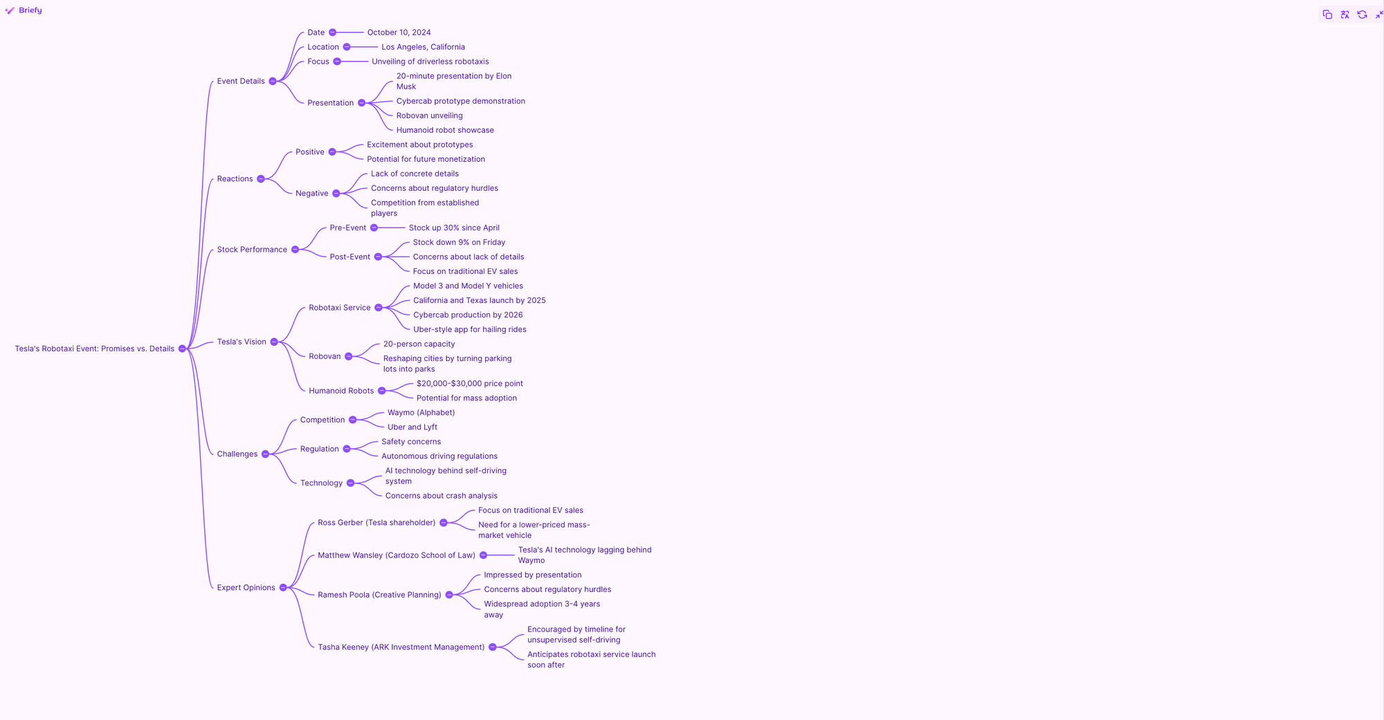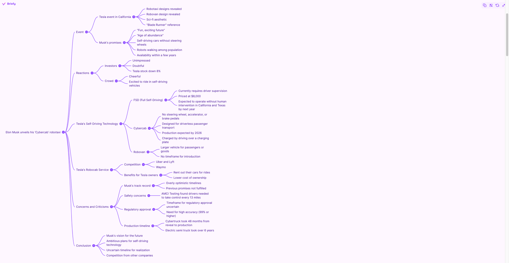 A visual breakdown showing the key themes, including event details, market reactions, technologies involved, Robocab services, and concerns and criticisms. Especially good for visual learners.