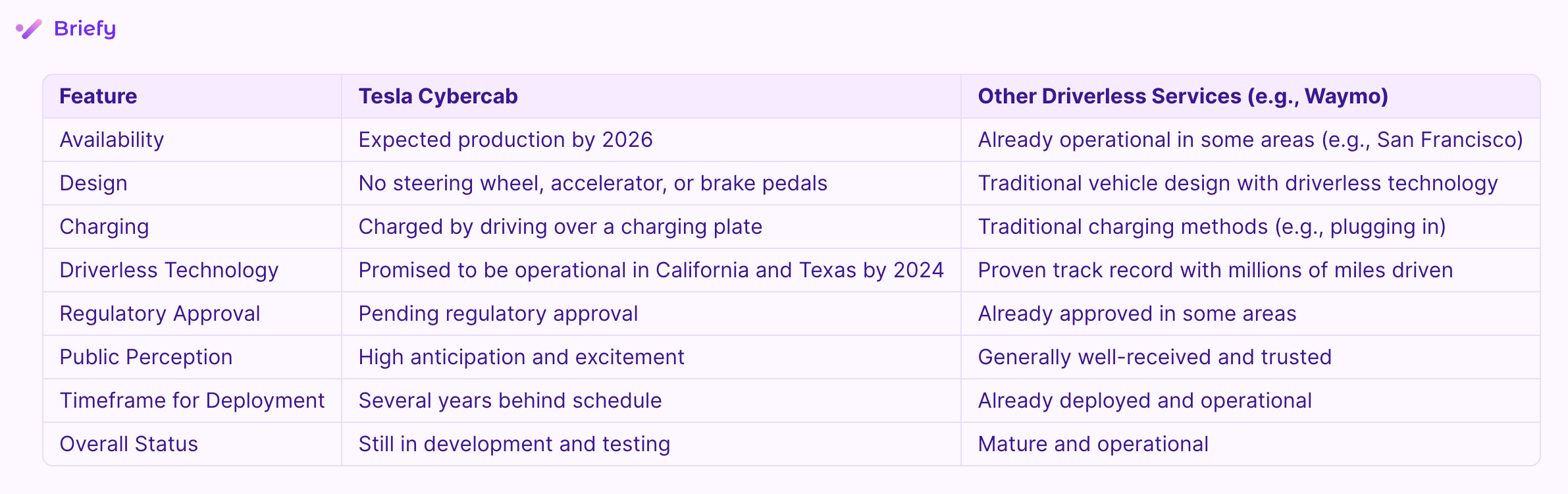 A detailed comparison showcasing the robotaxi's features, performance metrics, pricing strategies, and projected market impacts, allowing for a nuanced understanding of its significance within Tesla's broader vision.