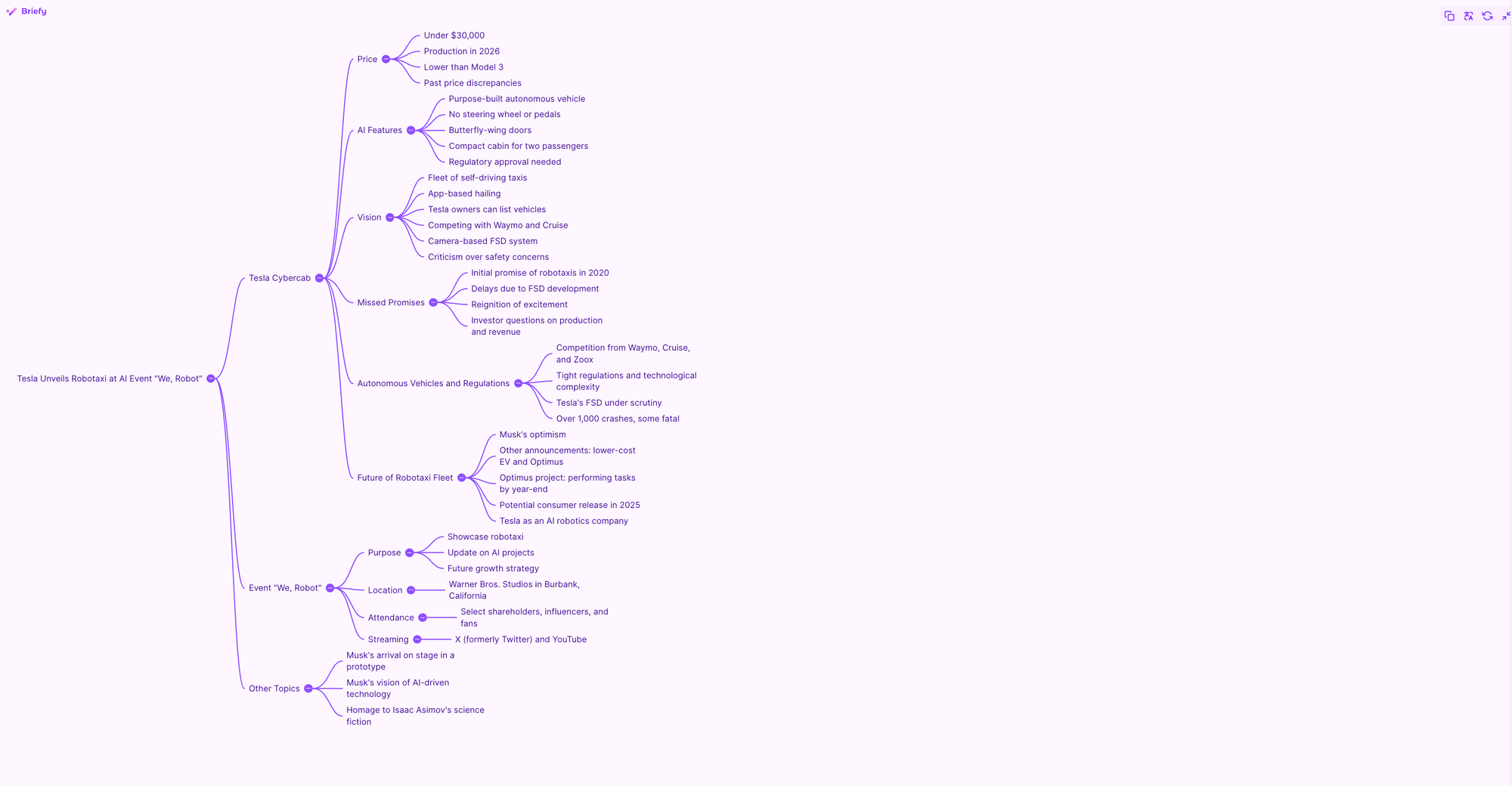 π Tesla's 'We, Robot' event marks a significant leap forward in tech innovation, and staying updated has never been easier with Briefy. Our tool helps you save time by summarizing the latest news, videos, and articles in just one click. Ready to experience more efficiency? Try Briefy today and streamline your information intake like never before!