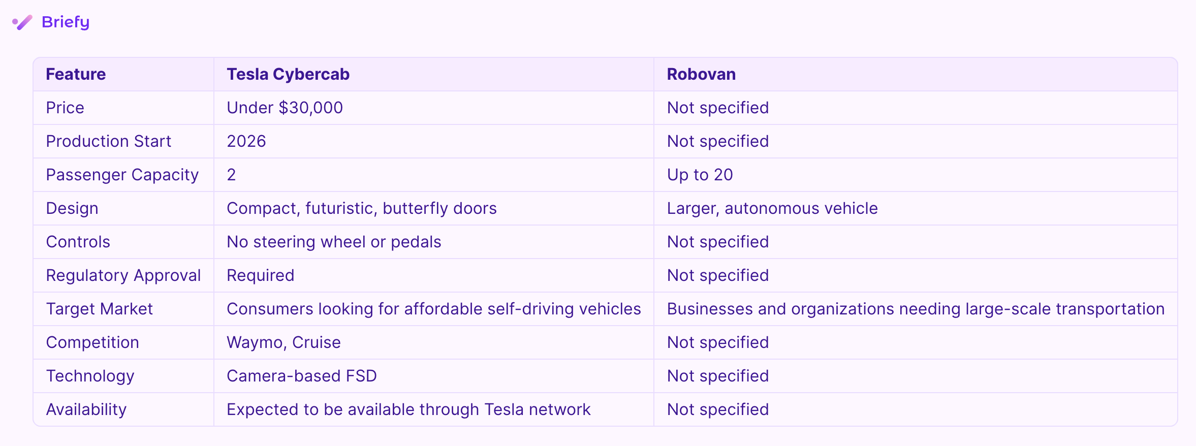 - ποΈ Tesla plans to start building the Cybercab by 2026 at a price of less than $30,000.