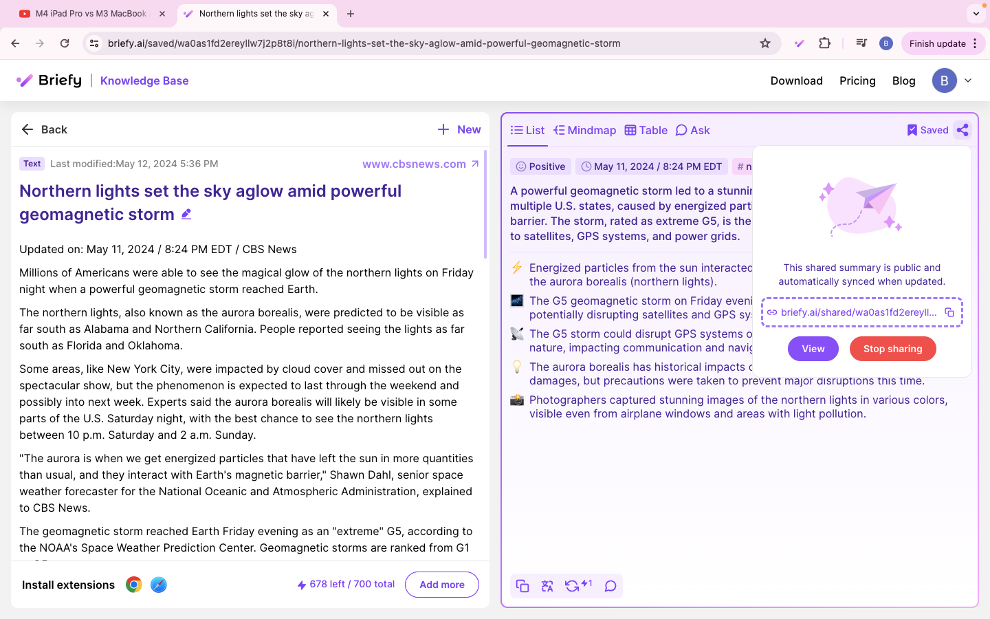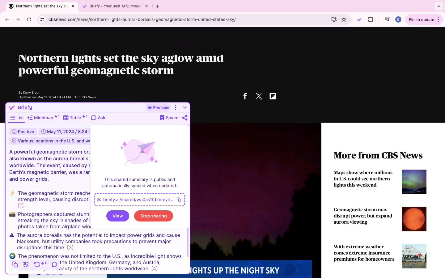 Once you have completed summarizing your content, simply click on the Share button located at the upper right corner of the magic window. With just a click, Briefy will promptly generate a permalink for you. You can then easily copy this link and share it with your colleagues, friends, or on your preferred social media platforms.π₯
