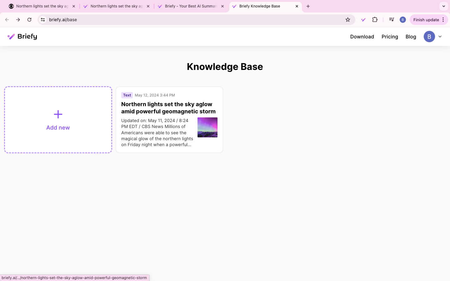 Wondering how to access your knowledge base? You can easily view your saved summaries by clicking the View button immediately after saving the summary. Alternatively, you can navigate to your knowledge base via your Briefy dashboard found in the extension bar.π»