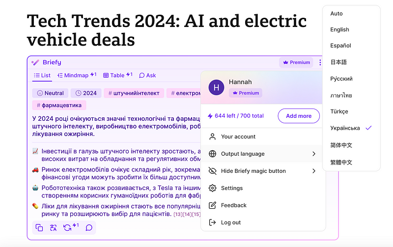 Briefy now supports Thai, Simplified Chinese, and Traditional Chinese in the output language. To access these new languages, just head to your Briefy extension menu and select ‘Output language.’ There, you’ll find these newly added options. 🌐