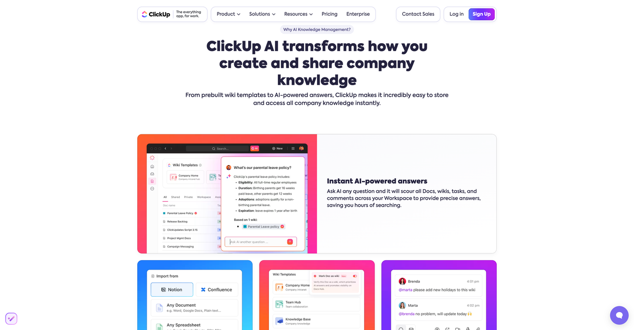 Empower your team with ClickUpโs advanced Knowledge Management tools. From prebuilt wiki templates to AI-powered answers, ClickUp transforms how you document and share company knowledge. This feature enables users to effortlessly organize, access, and answer questions, making company knowledge instantly available and searchable, fostering a smarter, more connected team.