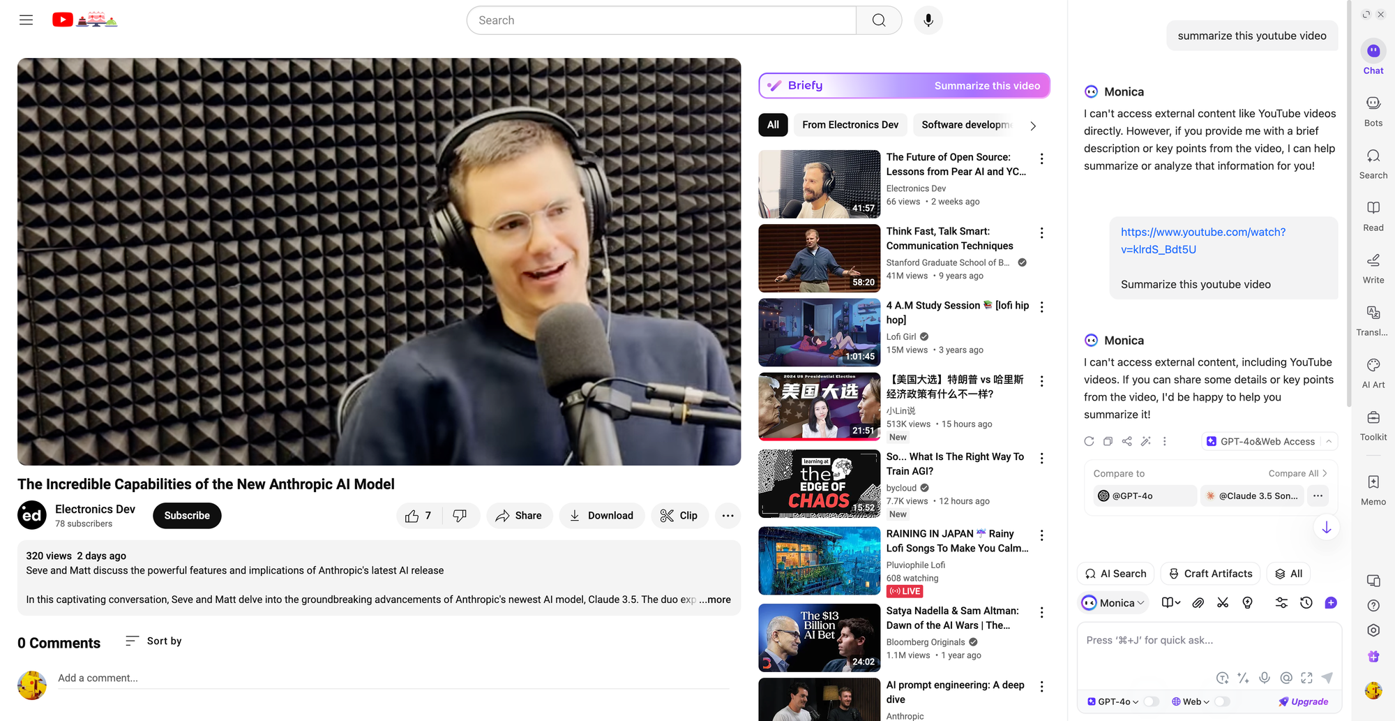 🤿 Monica AI offers solid summarization capabilities, especially for shorter documents and straightforward text on web pages. However, with constraints like limited file size and challenges in multi-source integration, it may not be the ideal solution for users needing comprehensive document or multimedia summarization.