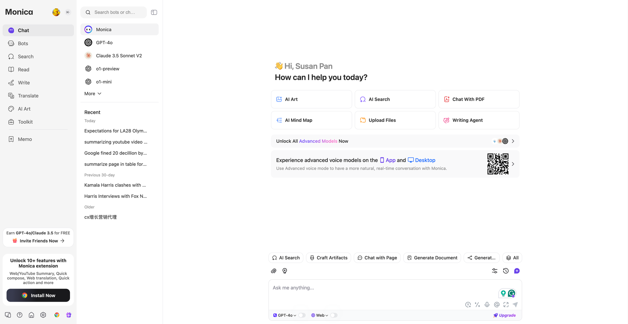 Monica AI is an advanced productivity tool designed to enhance various tasks through AI-driven functionalities. It integrates cutting-edge technologies such as GPT-4, Claude-3, and Gemini, providing users with a versatile platform for tasks like content creation, email management, translation, and more. Besides, it also supports over 120 languages and offers extensive template options, making it suitable for a wide range of users from individuals to large businesses.