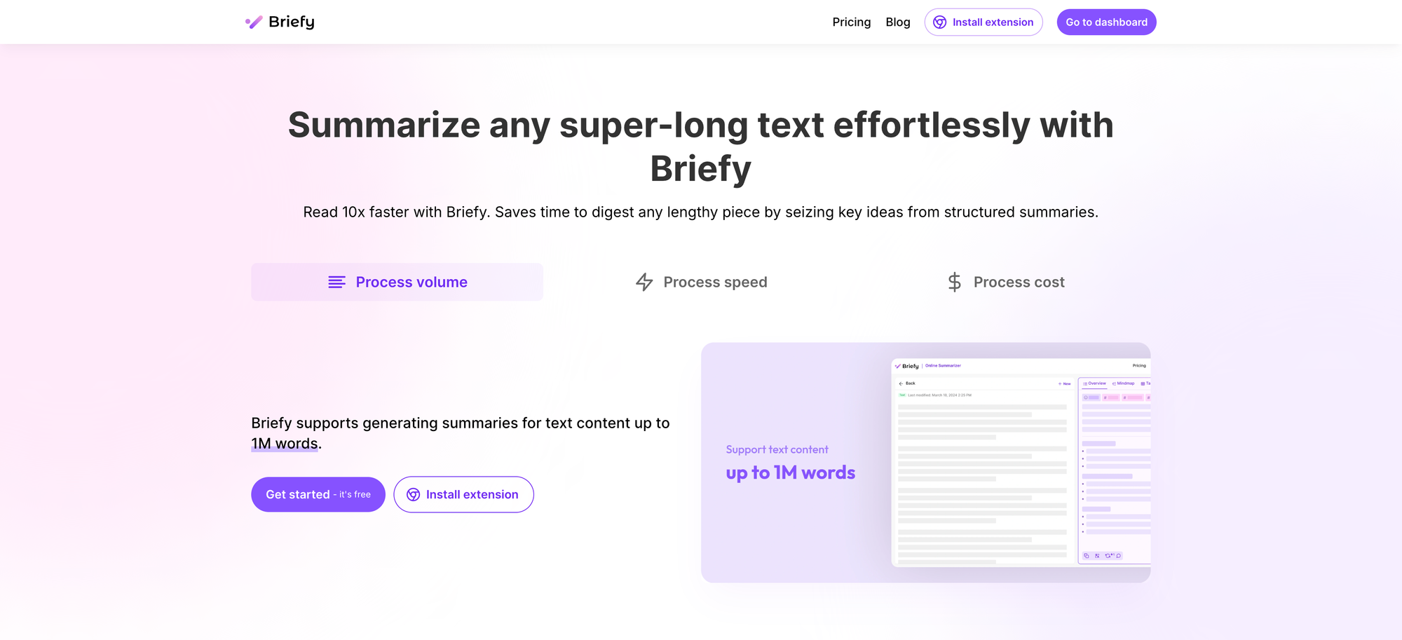 With support for summarizing content up to 1 million words, Briefy is ideal for digesting lengthy documents in no time. Briefy has been upgraded to handle even longer texts, supporting content up to 2 million words.