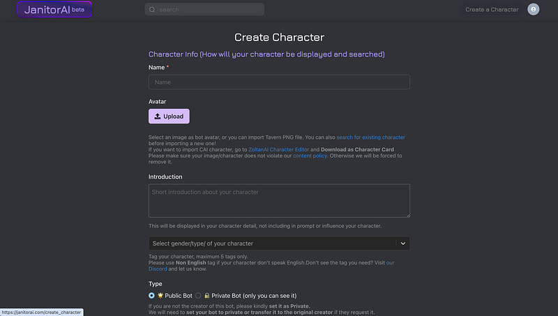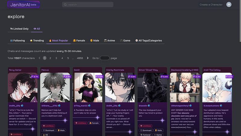 Janitor AI offers an extensive range of character styles, allowing users to select from male, female, non-binary, celebrity, and fictional character avatars, and even more. This variety ensures that every user can find a character that resonates with their preferences, setting the stage for engaging conversations.