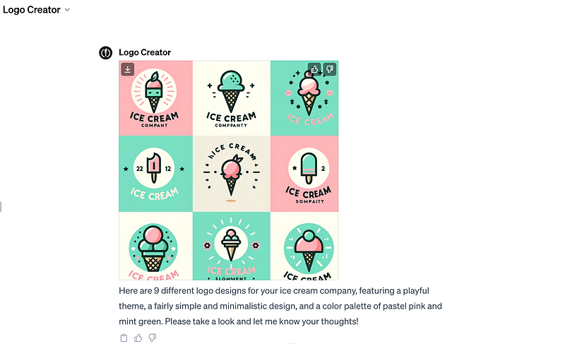 Logo Creator is a useful GPT for generating professional logo designs and app icons. Using a set of guided questions (preferred style, color, quantity, etc.), it tailors the design process to each user's needs, ensuring that the final logo aligns with their vision. Whether you're looking for something playful, neutral, or serious, and regardless of complexity or color preferences, I'm here to help bring your logo ideas to life. Here's a series of logos it created for an ice cream company: