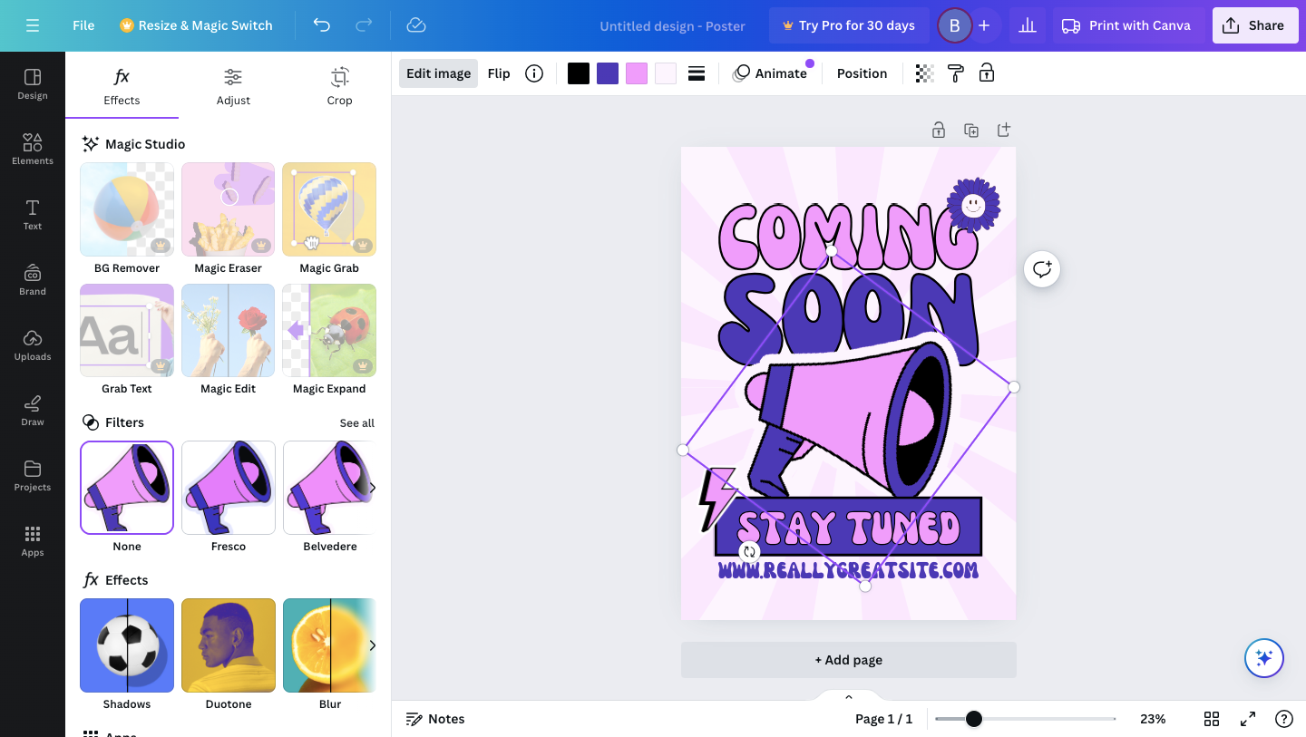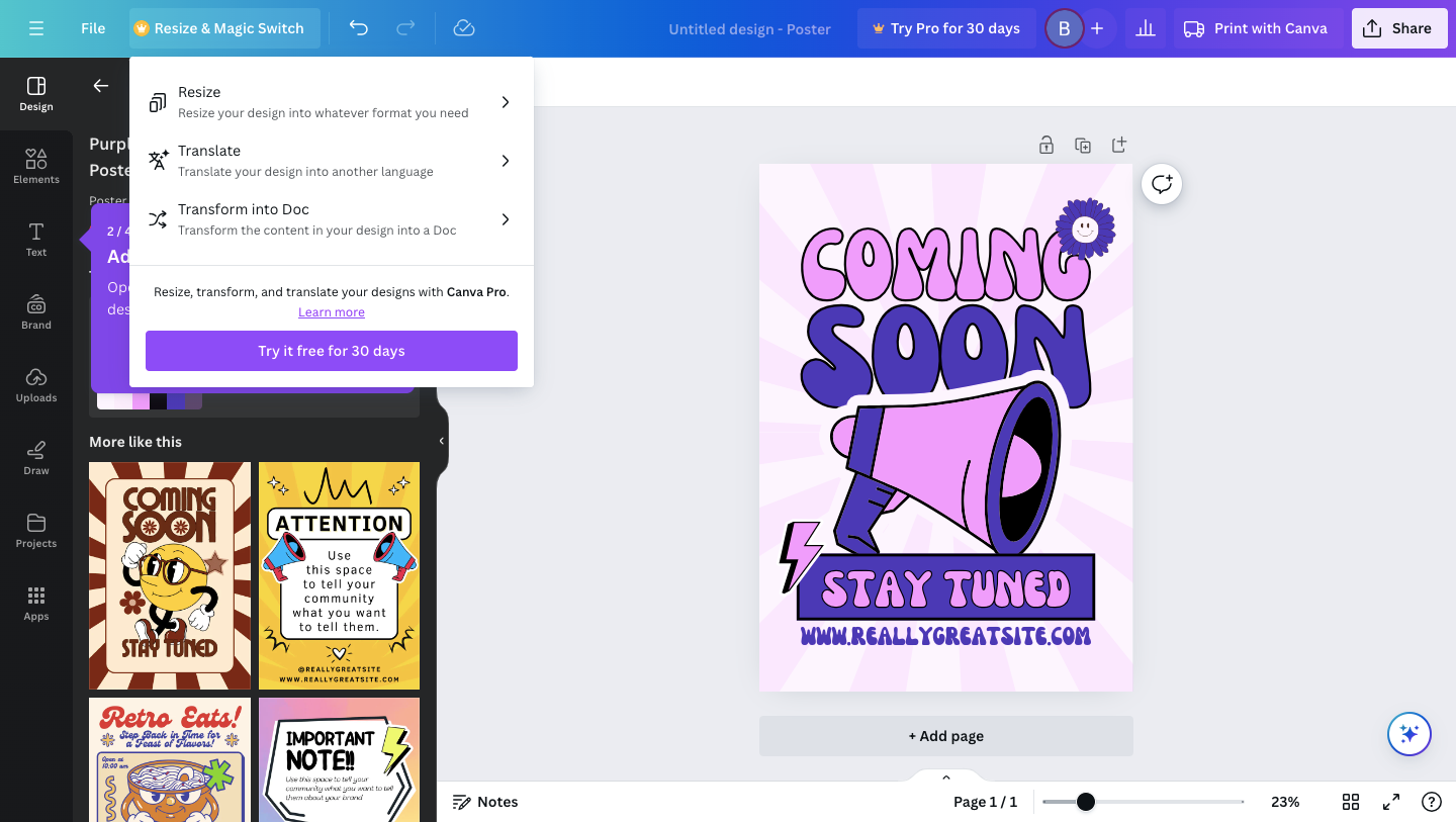 - Canva will automatically adjust your design to fit the new size, maintaining the design elements’ proportion and alignment.