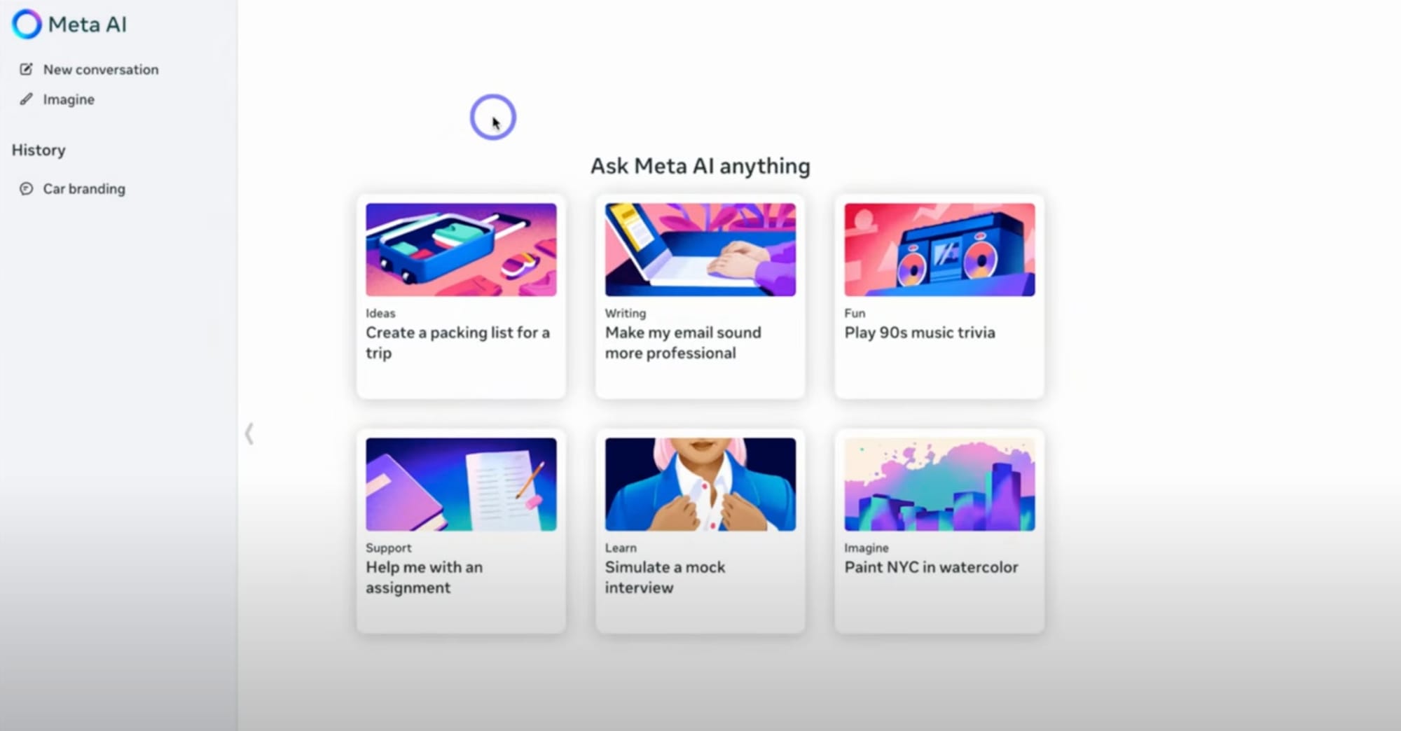 ⌨️ Simply type Meta.ai into your browser and it gonna directly take you to the Meta AI interface. With its clear arrangement, you can see two main features on the left sidebar, "New conversation" and "Imagine".